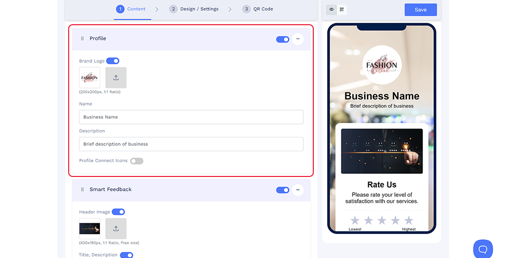 Add your brand logo, business name, and a brief business description. You can also include profile connect icons for contact shortcuts.