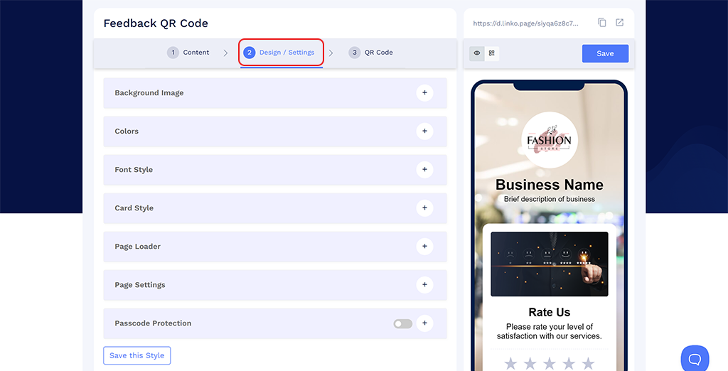 Click on the 'Design/Settings' tab to customize the page design with background image/video, colors, font style, card style, page loader, and more.