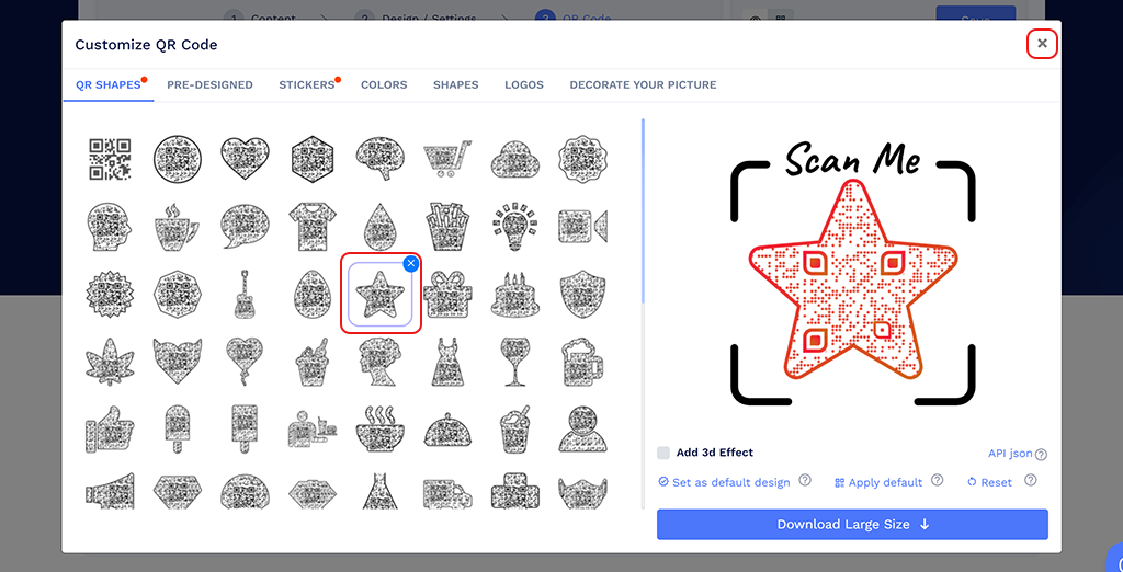 Note: Click on the 'x' icon of the 'Customize QR Code' popup to save changes.
