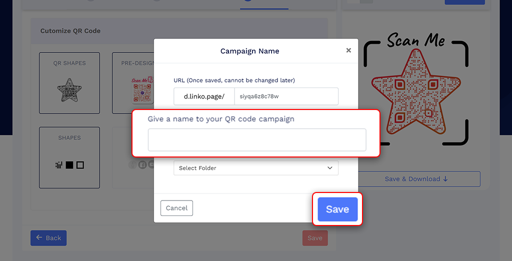 Click on the 'Save' button. Enter the QR Code name, edit the URL (optional), select folder (optional), and click on 'Save.'