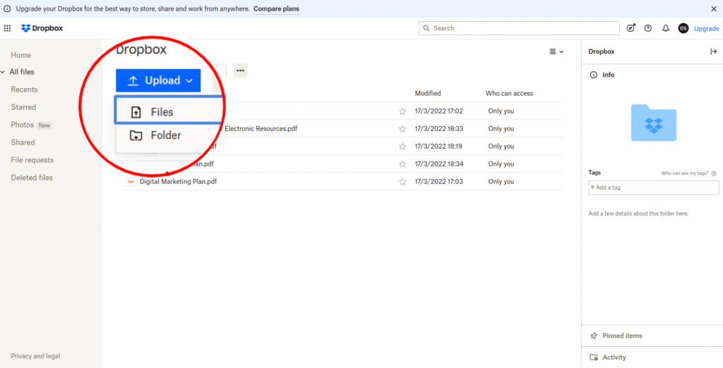 Upload your resume file by clicking on ‘Upload’ and then on ‘Files’.