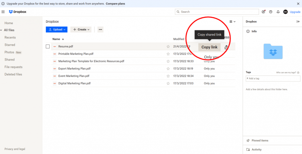 You can create a resume QR code by uploading your resume file in Dropbox. Follow these steps to get started: