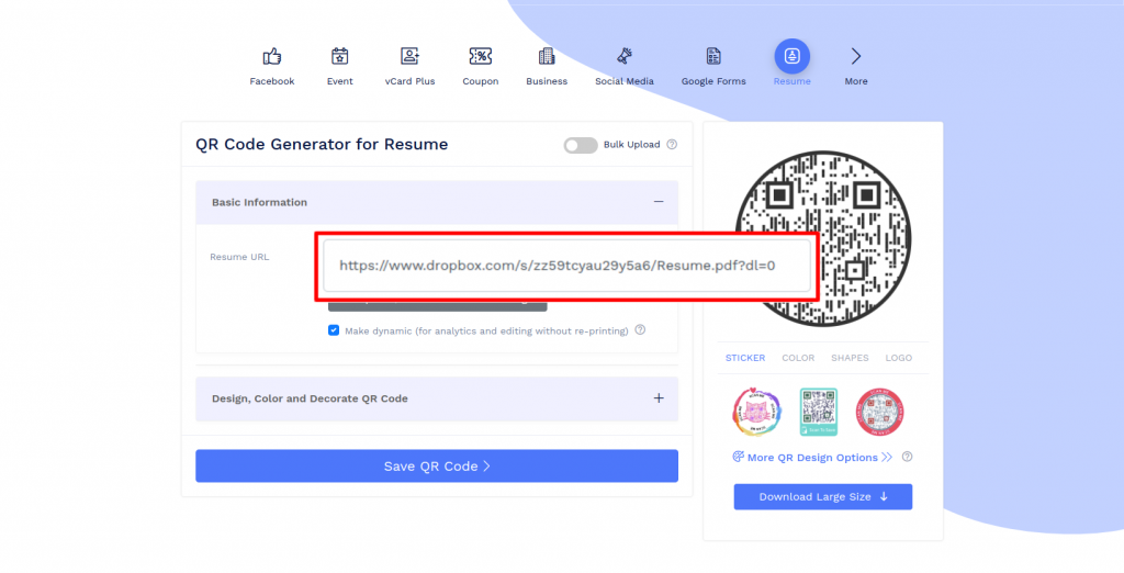 How to create a Resume QR Code by uploading the resume file on Dropbox?