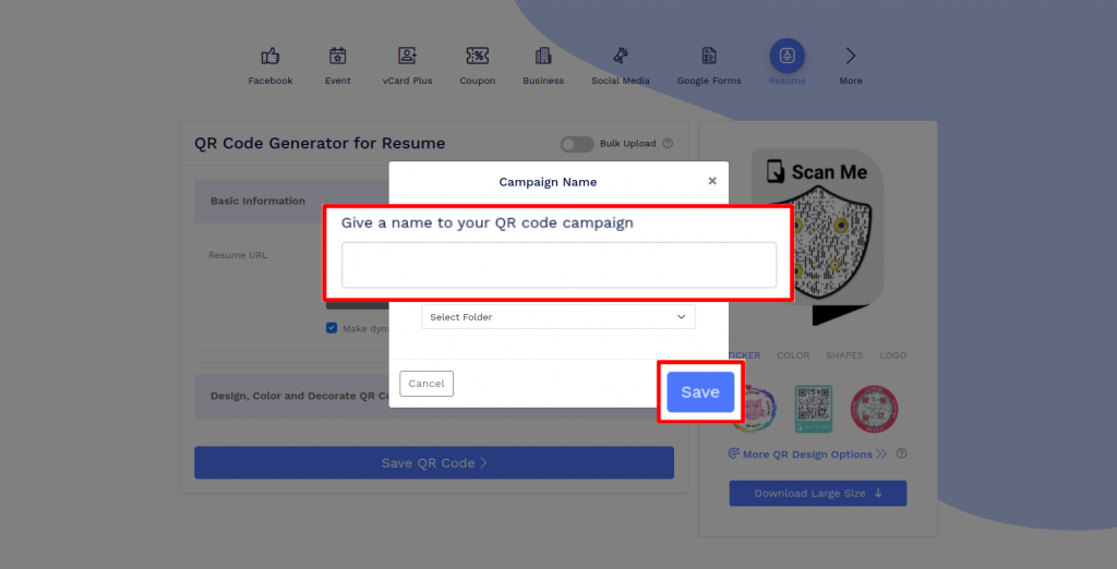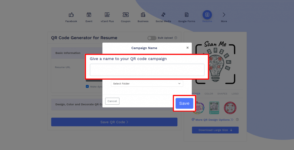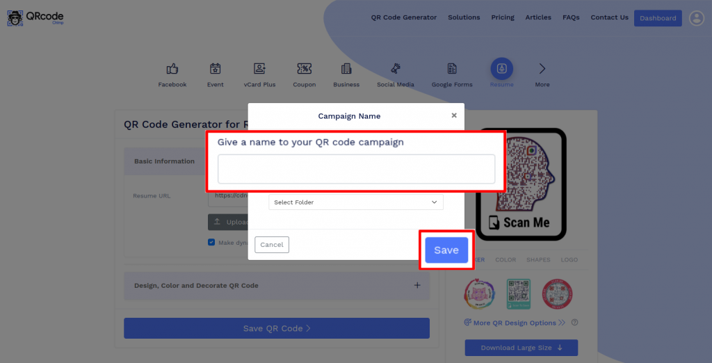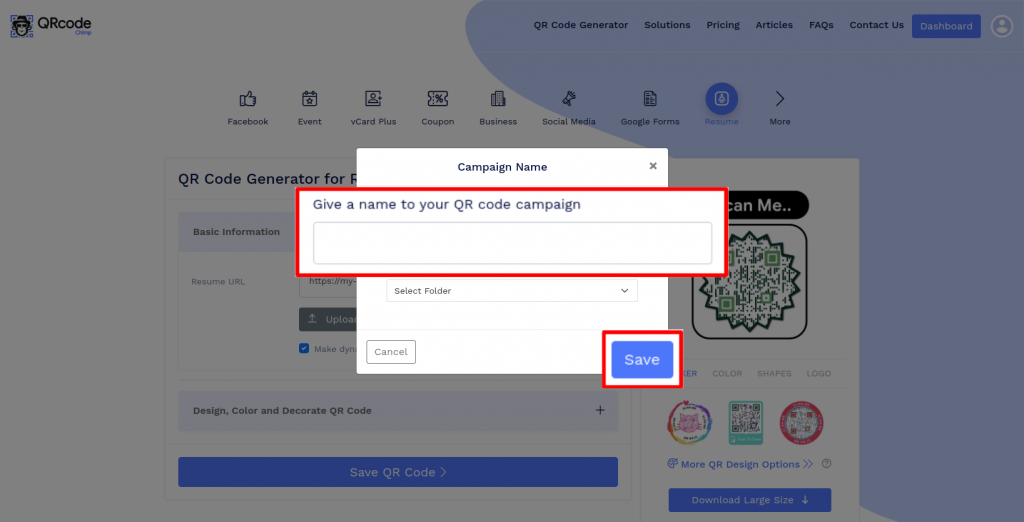 Save the QR Code by clicking on the ‘Save QR Code’ button, entering the QR name and then clicking on the ‘Save’ button.