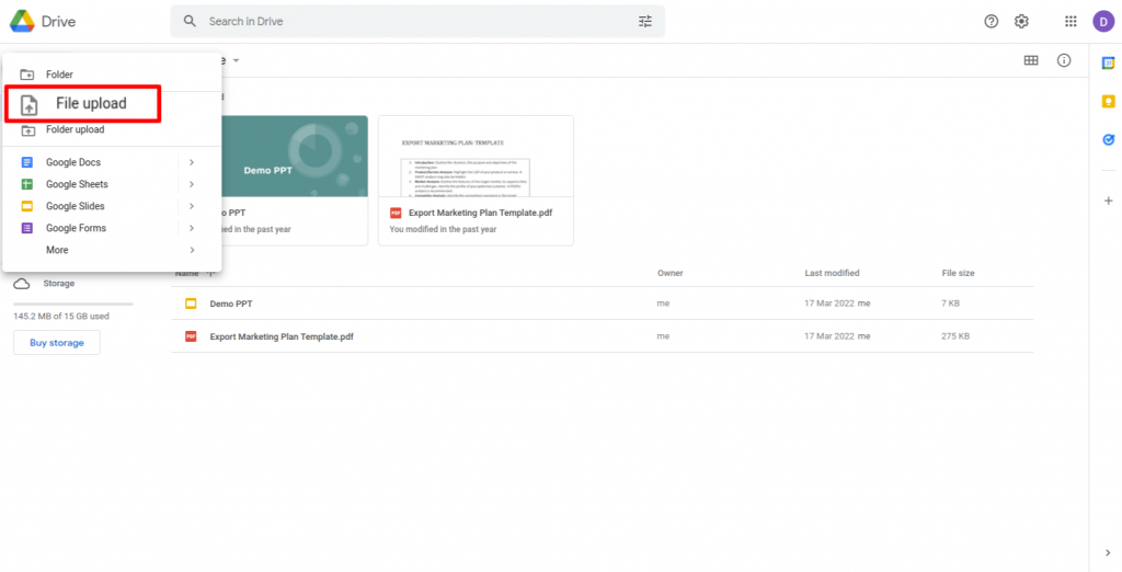 Upload your resume file by clicking on ‘New’ and then on ‘File upload’.