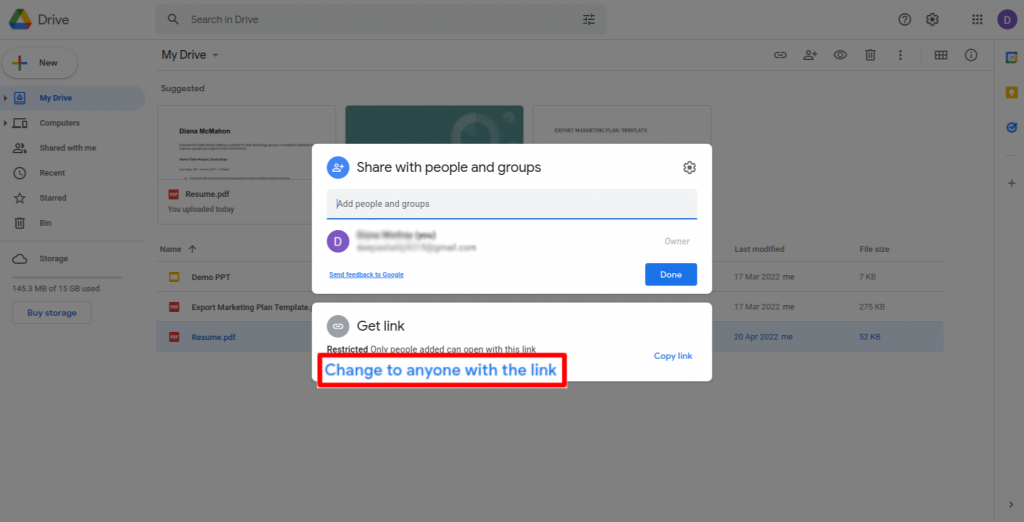 Click on ‘change to anyone with the link’ to ensure the file has access to view by anyone.
