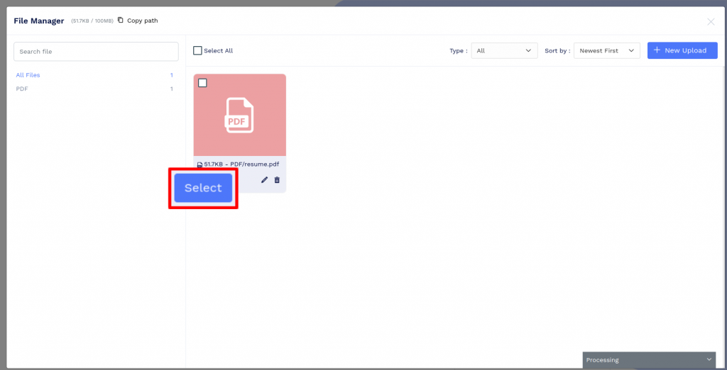 Upload your resume file by clicking on the ‘New Upload’ button or by ‘dropping the file’ in the file manager.